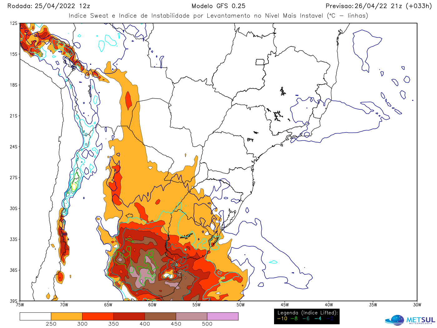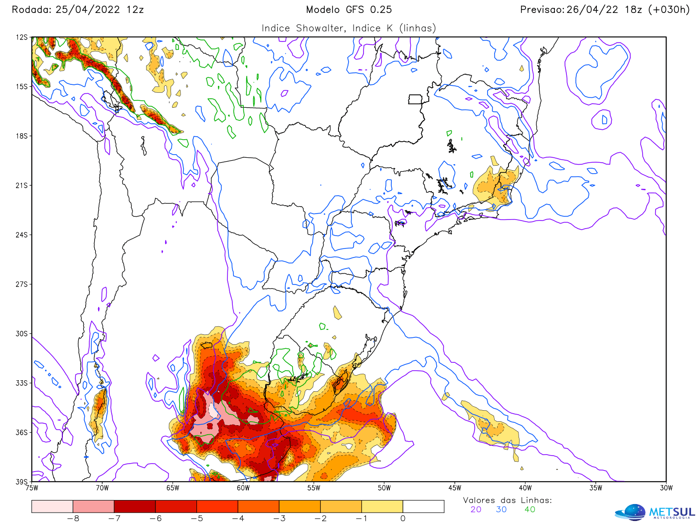 Therefore, numerical models indicate very high instability indices in central Argentina. Indicators such as CAPE, Lifted, SWEAT and Showalter have values predicted by numerical models between afternoon and Tuesday evening and early Wednesday in extremely severe weather levels.