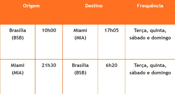 Depart for Miami at 10 a.m. and arrive in US City at 5:05 p.m., always on Tuesdays, Thursdays, Saturdays and Sundays. Return time on the same days of the week is 21:30, landing in Brasilia at 6:20: