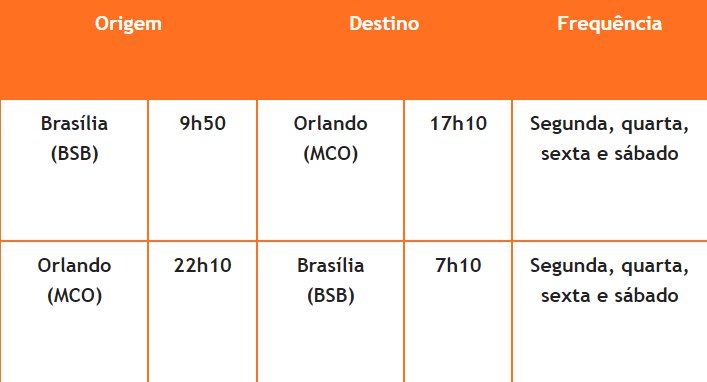 With GOL, both destinations will receive four rounds per week from Brasilia in May. Flights depart from the federal capital to Orlando at 9:50 a.m. and land in Florida at 5:10 p.m., returning on Mondays, Wednesdays, Fridays, and Saturdays at 10:10 p.m., the same day. Landing in Brazil at 7:10 am: