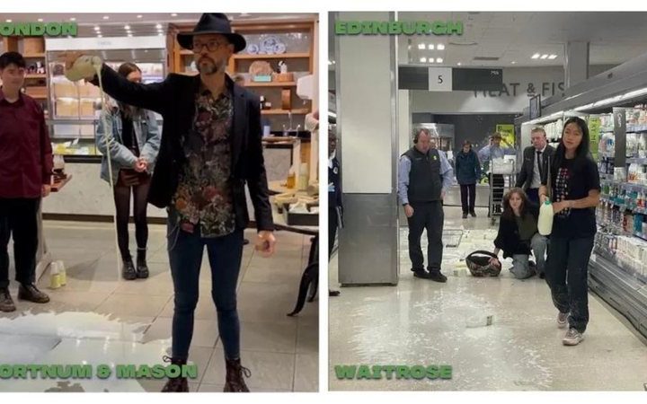 Vegan activists today (15) poured milk onto the floor and other food items in UK food shops to protest in...